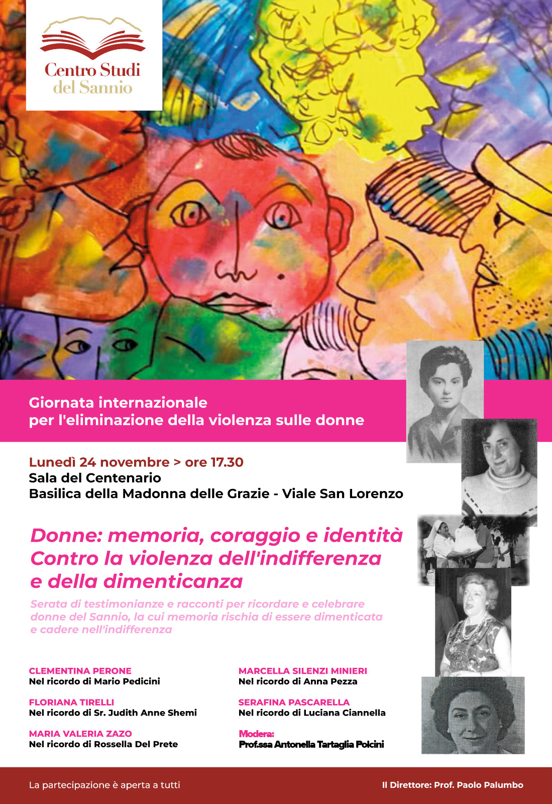 Il Centro Studi del Sannio organizza, in occasione della Giornata Internazionale finalizzata all’eliminazione della violenza sulle donne, una serata di testimonianze e racconti per ricordare e celebrare donne del Sannio la cui memoria rischia di essere dimenticata e cadere nell’indifferenza.